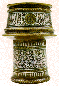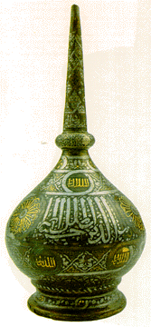 Rosewater sprinkler (brass: inlaid with silver & gold, mid 14th century).