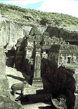 "Magic Mountain," is the literal translation of the Kailasanatha of Ellora. Most magnificent of all Hindu temples, it is representative of the mountain abode of Lord Shiva and the goddess Parvati, high in the heavenly Himalayas. Actually, Cave 16 is not a cave at all, but a free-standing sculpture 96 feet tall, 276 feet long and 154 feet wide. Unlike most architectural structures that are built from the ground upwards, this enormous temple was cut away from rock, downward. It is probably the world's largest monolith, perhaps surpassing the Greek Parthenon in splendor.